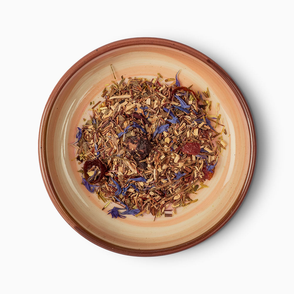Mezcla de rooibos con arándanos azules, rojos, escaramujo, hojas frambuesa y azulejos.